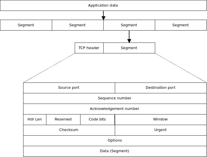 If the Internet Protocol (IP) is connectionless, the transport layer is all about connections. The transport-layer protocol in use -- we'll talk exclusively about Transmission Control Protocol or TCP here -- the L4 protocol is the last place in the stack where the entire message exists in one piece. L4 breaks up larger messages into segments. Each segment gets a TCP header, and gets passed on to L3 where it becomes an IP packet.