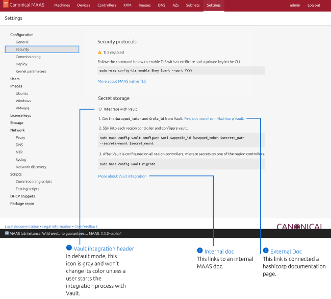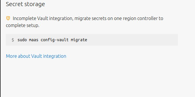 During migration, MAAS might be offline for a few seconds, but it will refresh quickly. After this command, MAAS will be fully integrated and functional with Vault. You can confirm success in the UI by checking Settings –> Configuration –> Security: