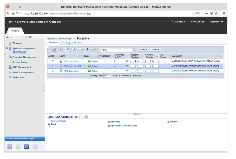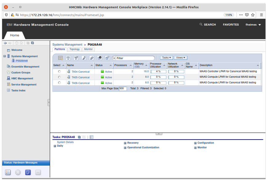 Such a MAAS controller LPAR should have at least two SMT hardware threads (one IFL), since it runs several services (bind, rack-, region-controller and more), 16 GB RAM and 100 GB disk space - recommended is to use the double amount of these resources.
