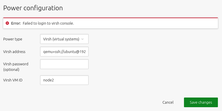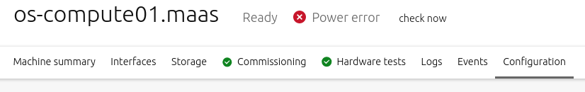 Click 'Save changes' to finish. Once that's done, MAAS performs a power check on the machine. A successful power check is a good indication that MAAS can properly communicate with the machine, that is, it should quickly result in a power status of "Power off". A failed attempt will show: