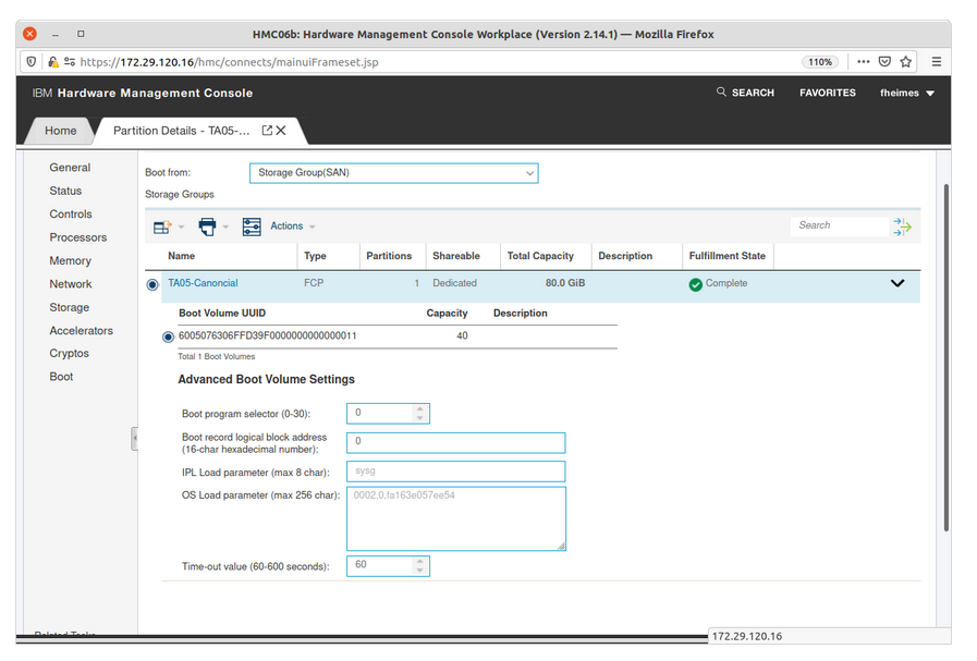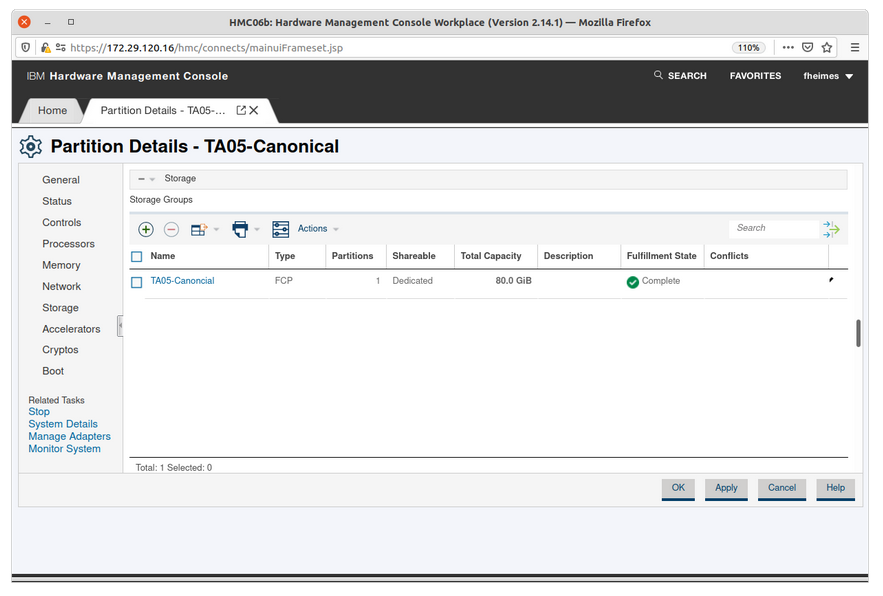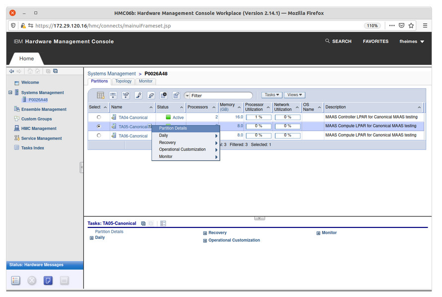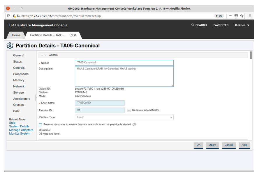 In order to prevent MAAS from taking over the entire system, you must assign both the controller and the ‘machines’ / KVM hosts to specific partitions, with suitable limitations. To set up suitable IBM Z partitions for hosting MAAS, you must choose “Partition Details” from the “Tasks Index,” which will bring you to a screen like this one: