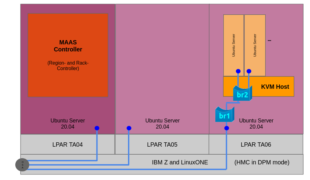 The MAAS controller does not necessarily need to run on an LPAR on the IBM Z system itself, but can also run on a different system outside. But since the MAAS controller requires a network connection to the hardware management console (HMC), it is recommended to keep it co-located and (for security reasons) as close as possible to the HMC and run it in a dedicated LPAR.