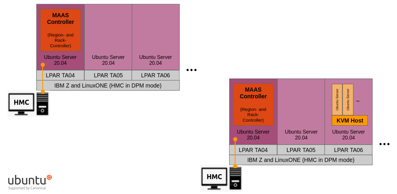 The IBM Z or LinuxONE system can host MAAS controllers and is able to deploy predefined logical partitions (LPARs) KVM host(s), and virtual machines, if the mainframe is set up properly for MAAS.
